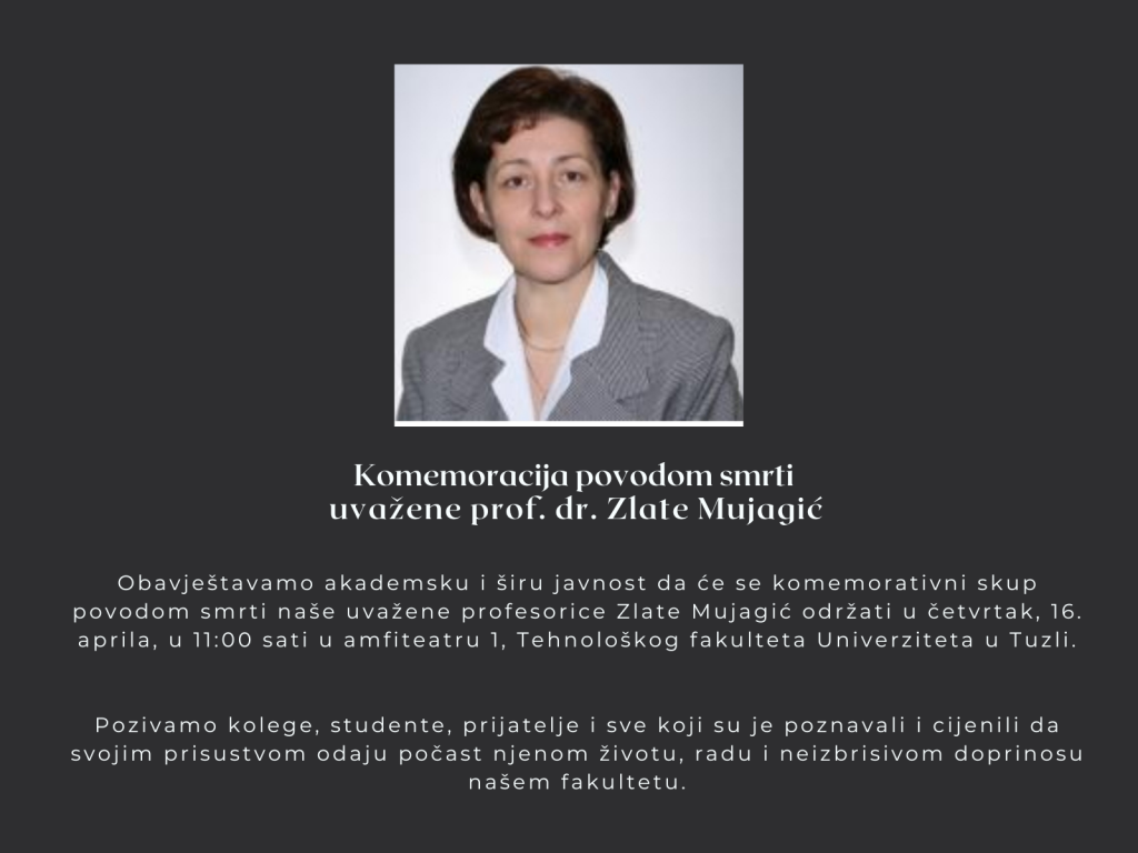 Poštovani članovi akademske zajednice, cijenjeni studenti i prijatelji Farmaceutskog fakulteta Univerziteta u Tuzli, S dubokim žaljenjem obavještavamo Vas da je 13.04.2026. godine, u 69. godini života, preminula prof. dr. Zlata Mujagić, redovna profesorica na užoj naučnoj oblasti „Biohemija“ Farmaceutskog fakulteta Detaljnije